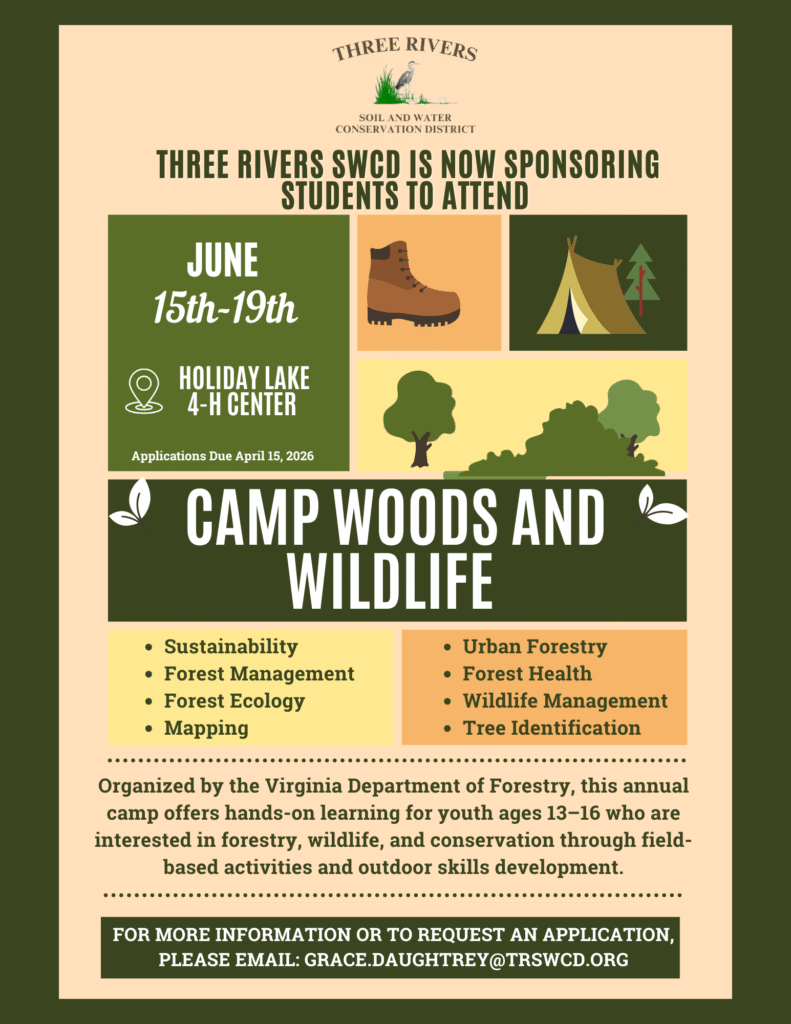 Along with sponsoring a student for Youth Conservation Camp, Three Rivers SWCD also sponsors students for Camp Woods and Wildlife Forestry Camp, which is held at Holiday Lake 4-H Center in the Appomattox – Buckingham State Forest.