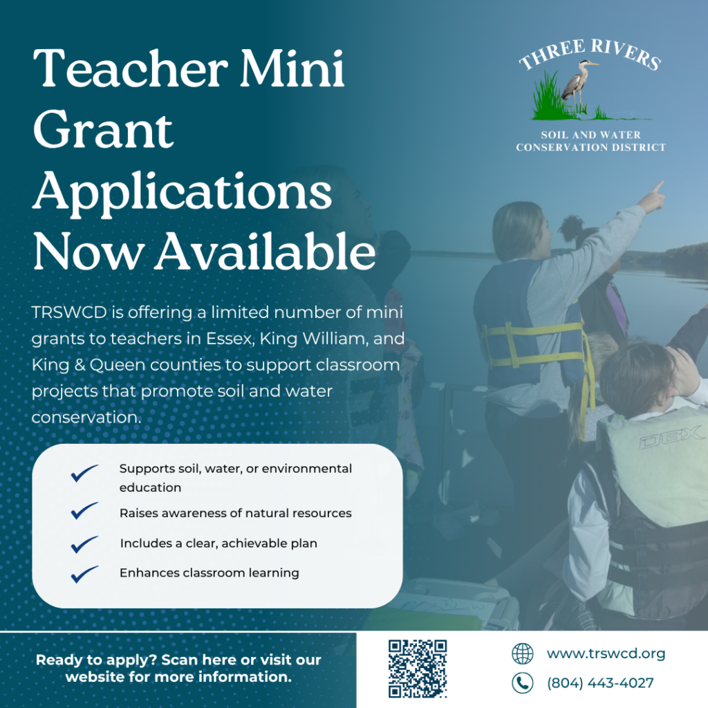 The TRSWCD Teacher Mini Grant Program supports local educators in bringing soil and water conservation concepts into the classroom through hands-on projects, innovative materials, and curriculum enhancement.